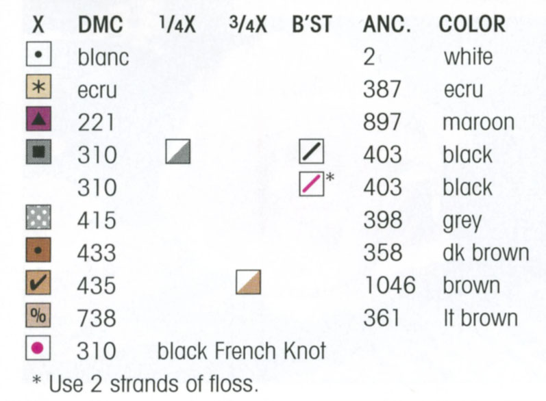 This design was stitched on a 14" x 15" piece of Black Aida (14ct). Three strands of floss were used for Cross Stitch, 1 for Backstitch, and 2 for French Knots, unless otherwise noted in the color key.