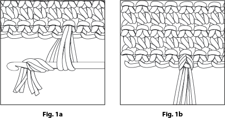 With wrong side facing and using a crochet hook, draw the folded end up through a stitch and pull the loose ends through the folded end (Fig. 1a); draw the knot up tightly (Fig. 1b). Repeat as desired. Lay Afghan flat on a hard surface and trim the ends.